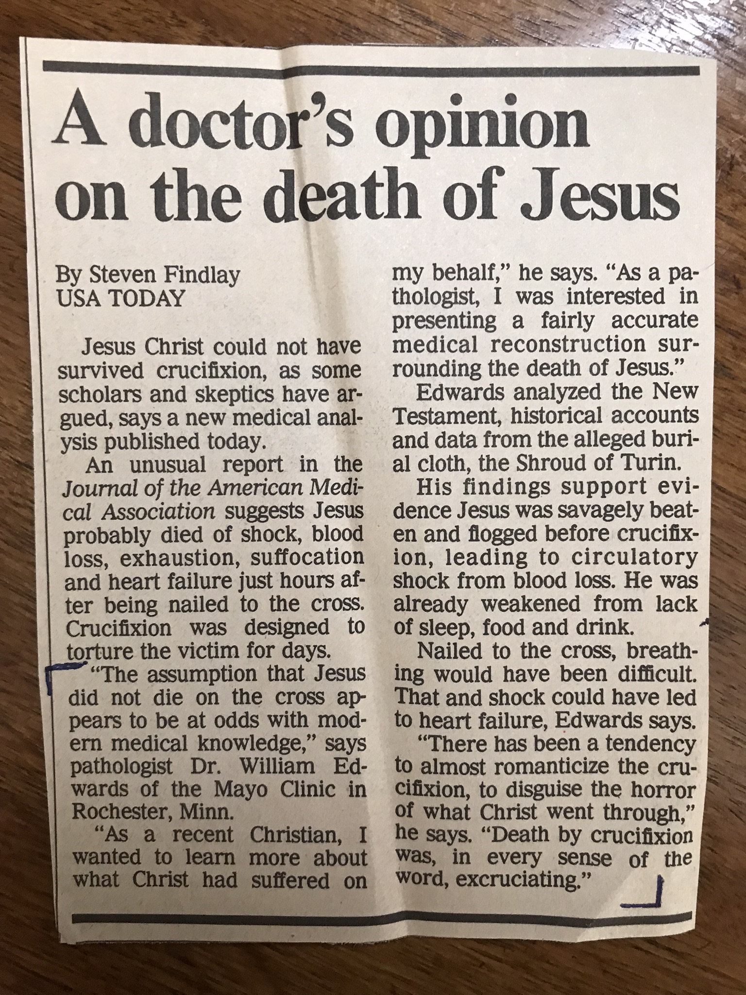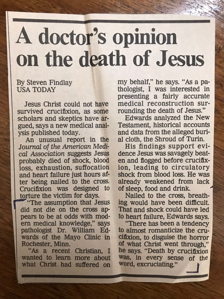 I did happen to come across a small article in USA Today written by Steven Findlay in 1986 titled, A doctor’s opinion on the death of Jesus. I found it in a file among some other papers and writings from the 1980s. You can read the brief article below.